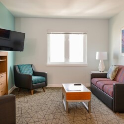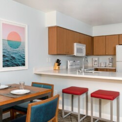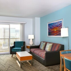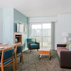 This resort offers one-, two- and three-bedroom resort suites that sleep four to eight guests and measure in the range of 636 – 1,305 square feet. At Anaheim you'll find the ideal suite for your vacation whether it is a couple's escape or a family trip! All suites include a king bed in the master bedroom, and one sleeper sofa in the living area. Additionally, two-bedroom suites offer two twin beds in the guest bedroom and three-bedroom suites offer a queen bed in the second bedroom and two twin beds in the third. You will love having a full kitchen and dining area and a washer/dryer in your suite, amenities that will save you money during your trip. Plus, suites include a patio or balcony for you to spend beautiful California afternoons watching the sunset.