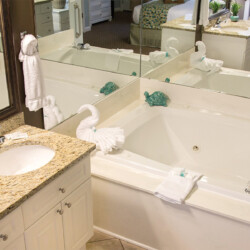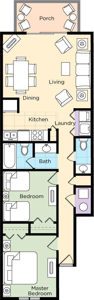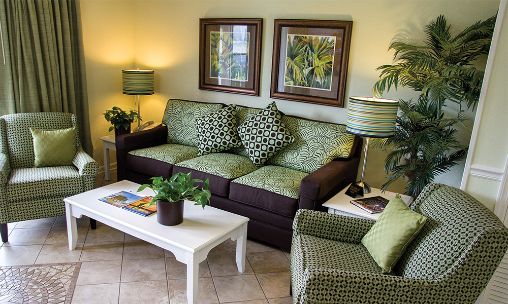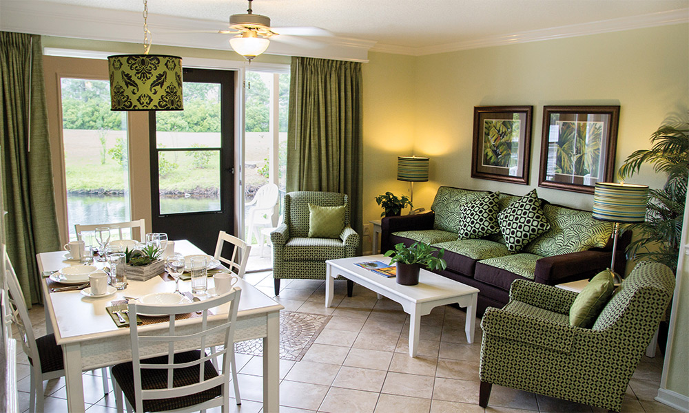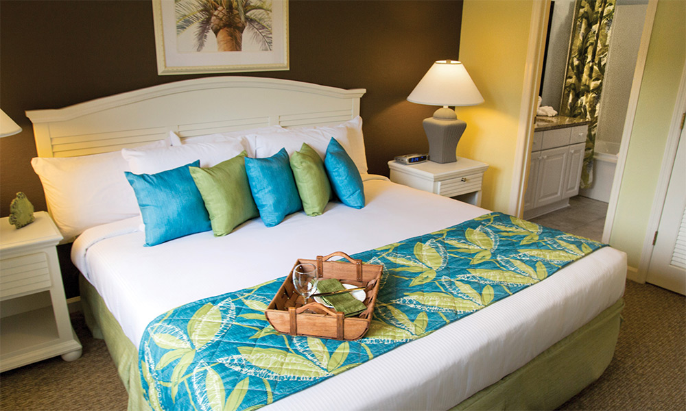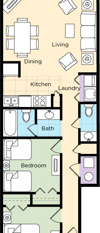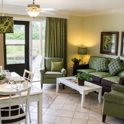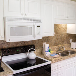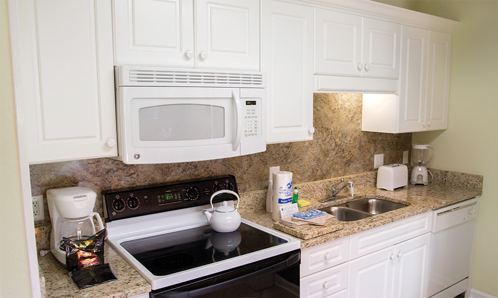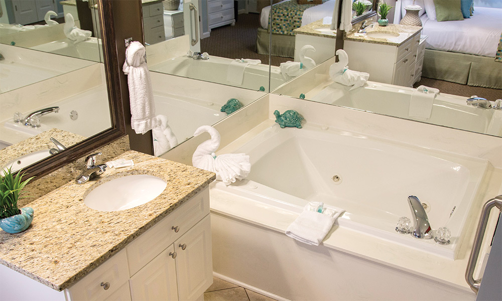 The resort offers spacious studio, one-, and two- bedroom resort suites that sleep four to twelve guests. One-bedroom resort suites include a king bed in the master bedroom and a sleeper sofa in the living area. Two-bedroom suites include a king bed in the master bedroom, two double beds in the guest room and a sleeper sofa in the living area. All suites offer a washer/dryer for your convenience. One- and two-bedroom suites are equipped with a full kitchen and dining area and a balcony/patio for your enjoyment. Two- bedroom resort suites are also available in loft style.